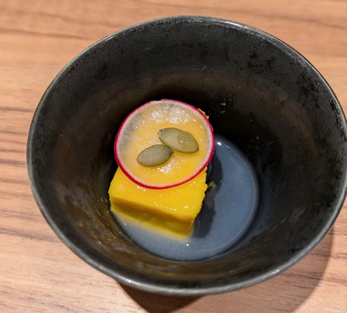 さて、メニューを見ながら注意深く注文を行った。うかつに頼んで、驚くような会計になったら、困るのでほどほどにオーダー。まずは「かぼちゃの口取り」。口取りとは宴の席で最初に供される甘い料理を指す。要するに先付けなのだが、これはサービスではなく500円。つまりは席料だな。