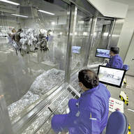 この部屋ではウイスキーのテイスティングが行われており、テーブルの四方に設置されている銀色の装置が特徴的です。ウイスキーのブレンドを行うブレンダーは、一日に何種類ものウイスキーのサンプルを試飲するため、口に含んだウイスキーをすべて飲んでしまうとお酒が回ったり味わいを感じにくくなってしまいます。そのような事態を防ぐためにも、口に含んだウイスキーを飲みこむのではなく、銀色の装置に出すそうです。
