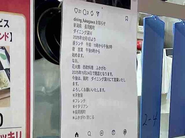 『道の駅ながおか花火館』のフードコート『ながおかKitchen』にある『西欧料理ふかがわ』が閉店するらしい。