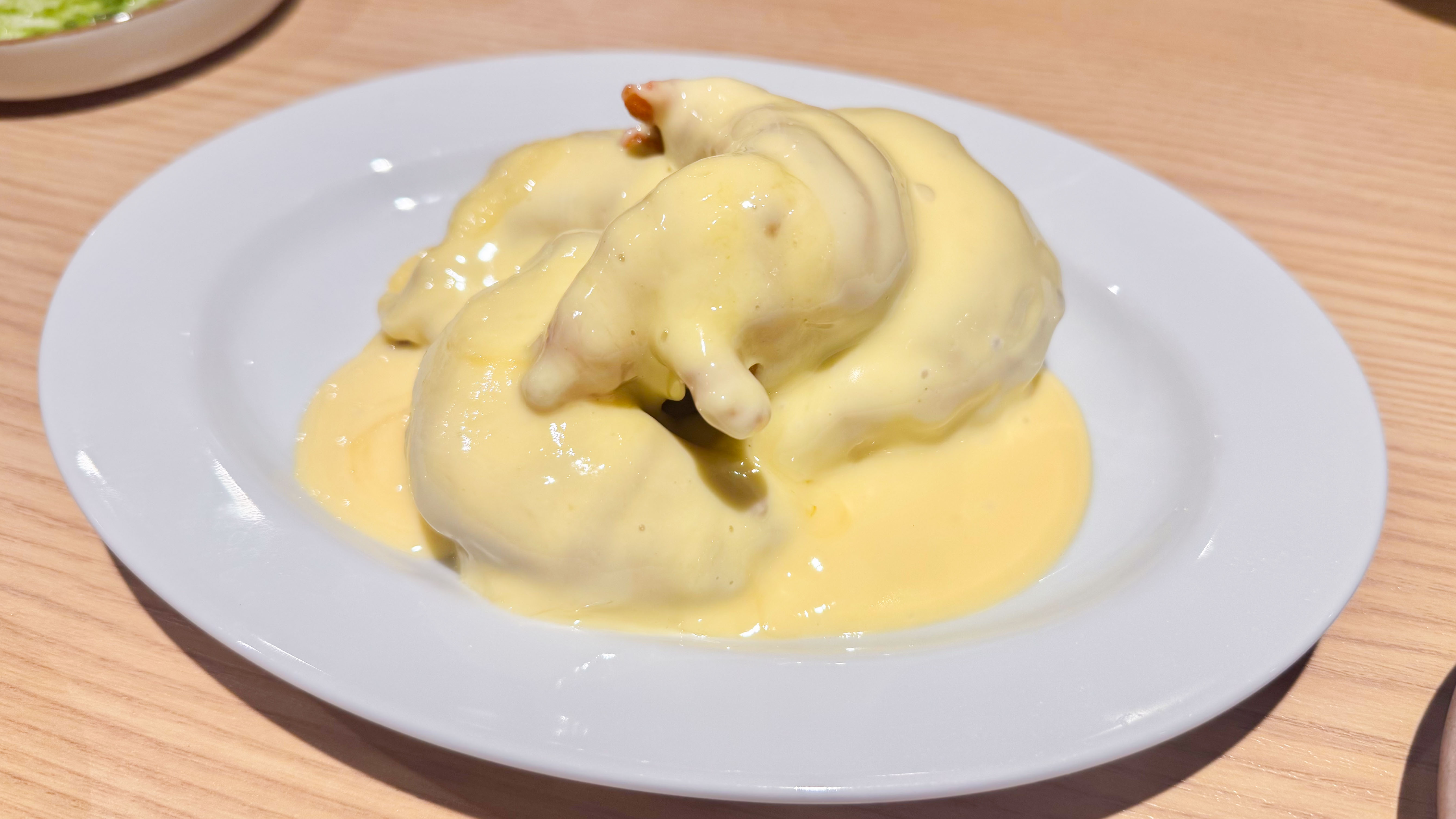 大ぶりのエビフライの上に、マヨソースがたっぷりとかけられた贅沢な一皿。見た目は「重たそう…」と思ってしまうかもしれませんが、実際に食べると軽すぎてびっくりします!
