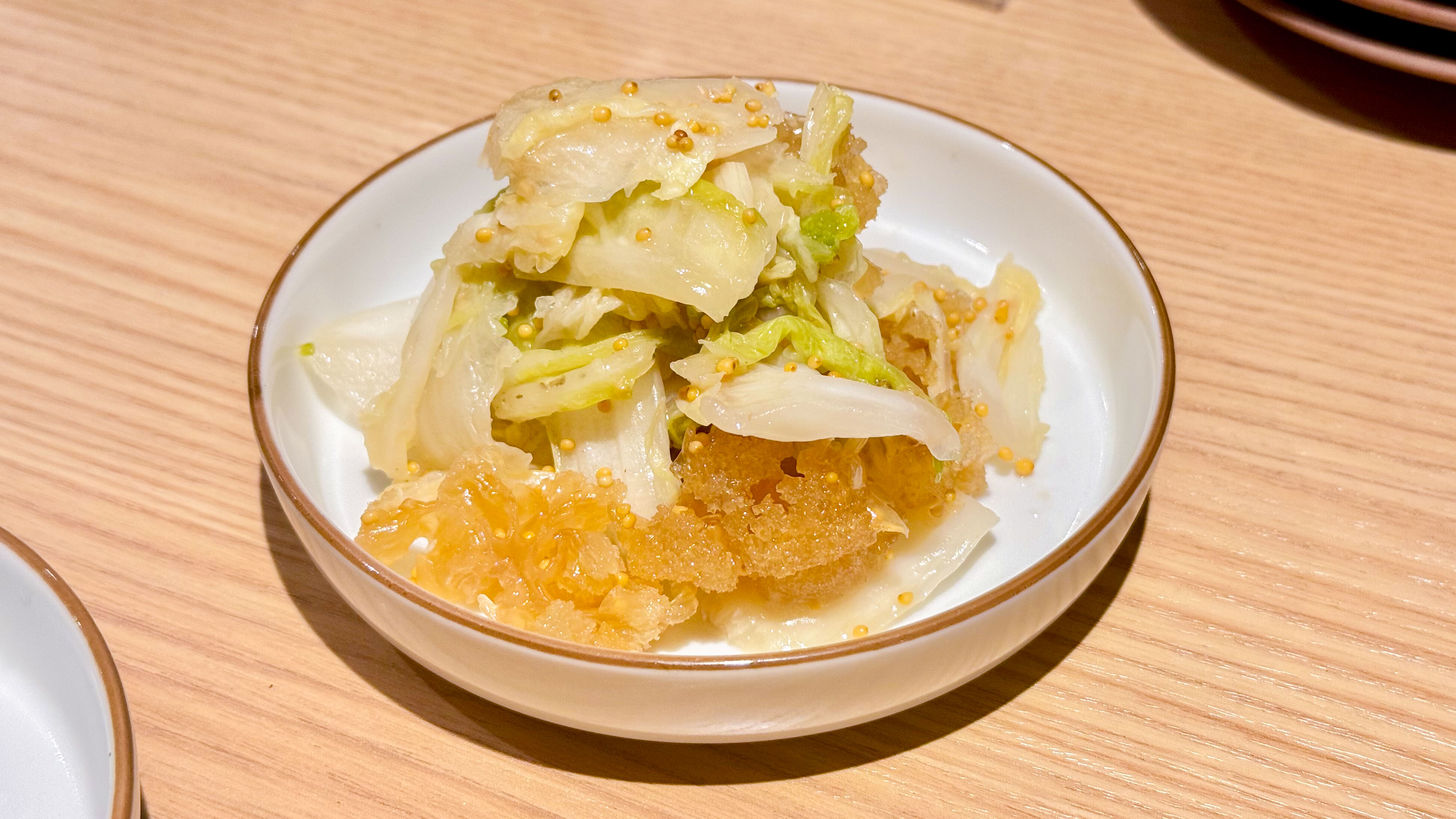 まずいただいたのがこちら。シャキシャキの白菜とコリコリのくらげの食感のコントラストが楽しめる前菜です。