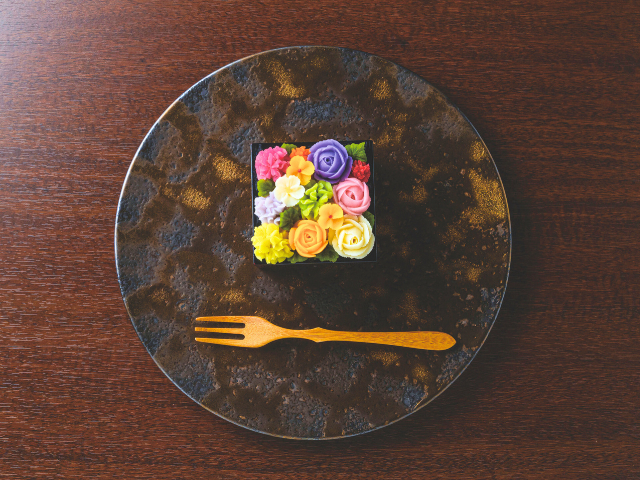 日本庭園を眺めながら味わうブーケのような和風ケーキは、ていねいで自分を大切にしていることを感じるひと時を過ごせます。