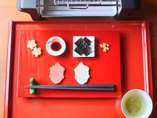紅白亀甲餅焼き体験 935円 焼きたてのお餅をセットの紅梅宝舟昆布茶と味わおう