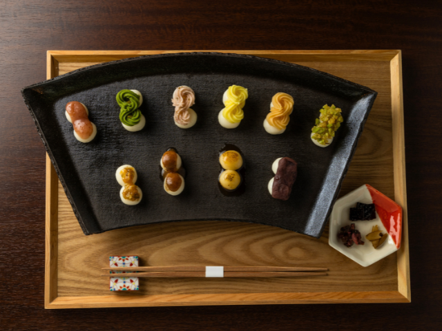 デザートは通年同じで、枯山水がモチーフの1皿。岩はすべてお菓子で、砂利に見立てた砂糖には砂紋が引かれていて遊び心満載のスイーツも楽しめます。