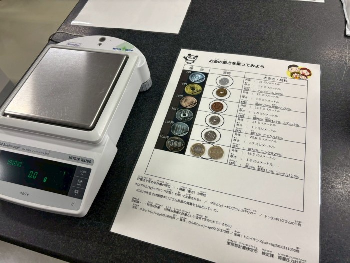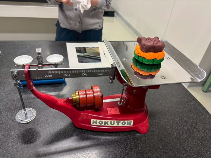 公式キャラクターの「はかるん」をイメージしたハンバーグ(?)を使って、複数のはかりで重さを確認してみたり、お金の重さを調べたりといった体験をさせていただいた。