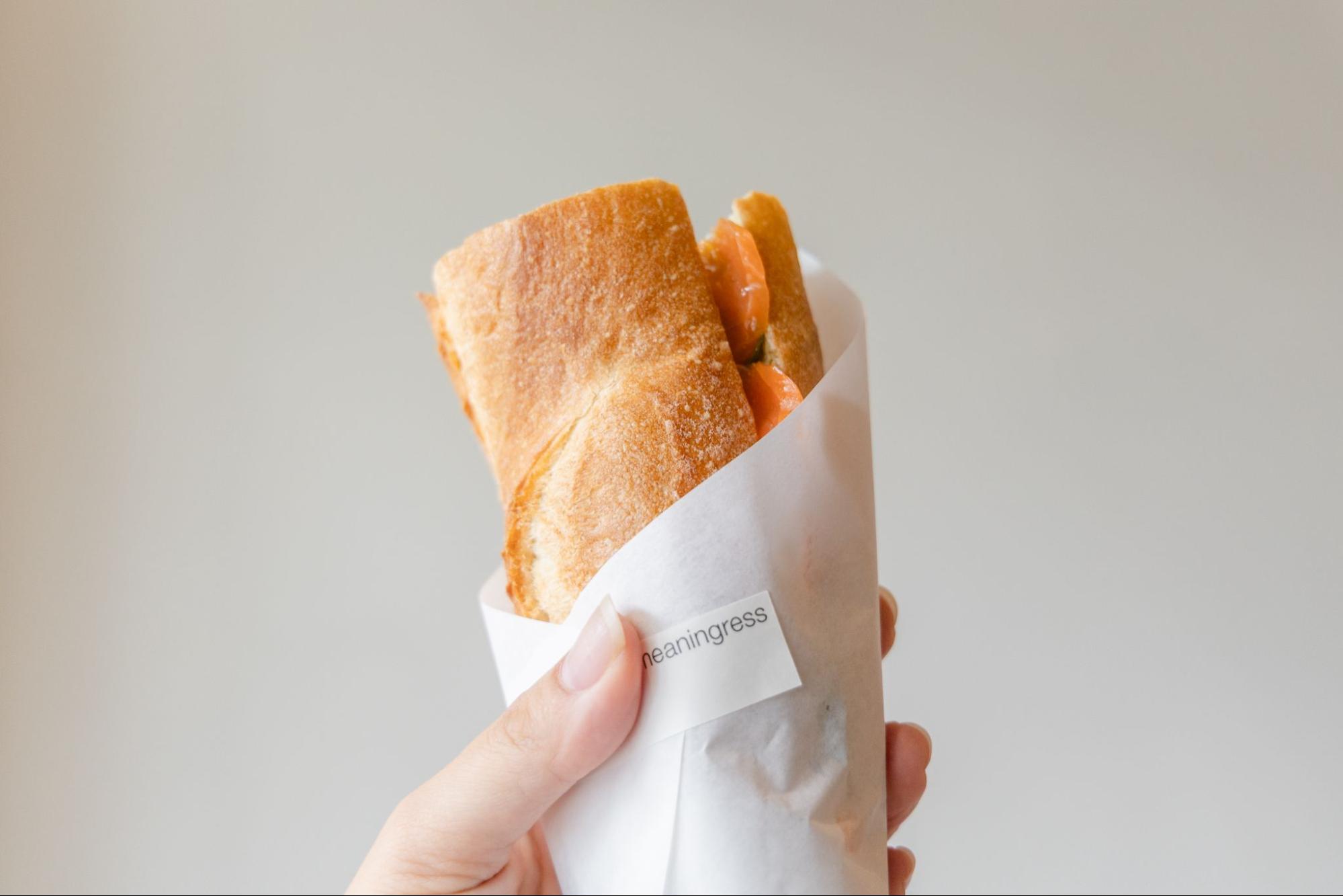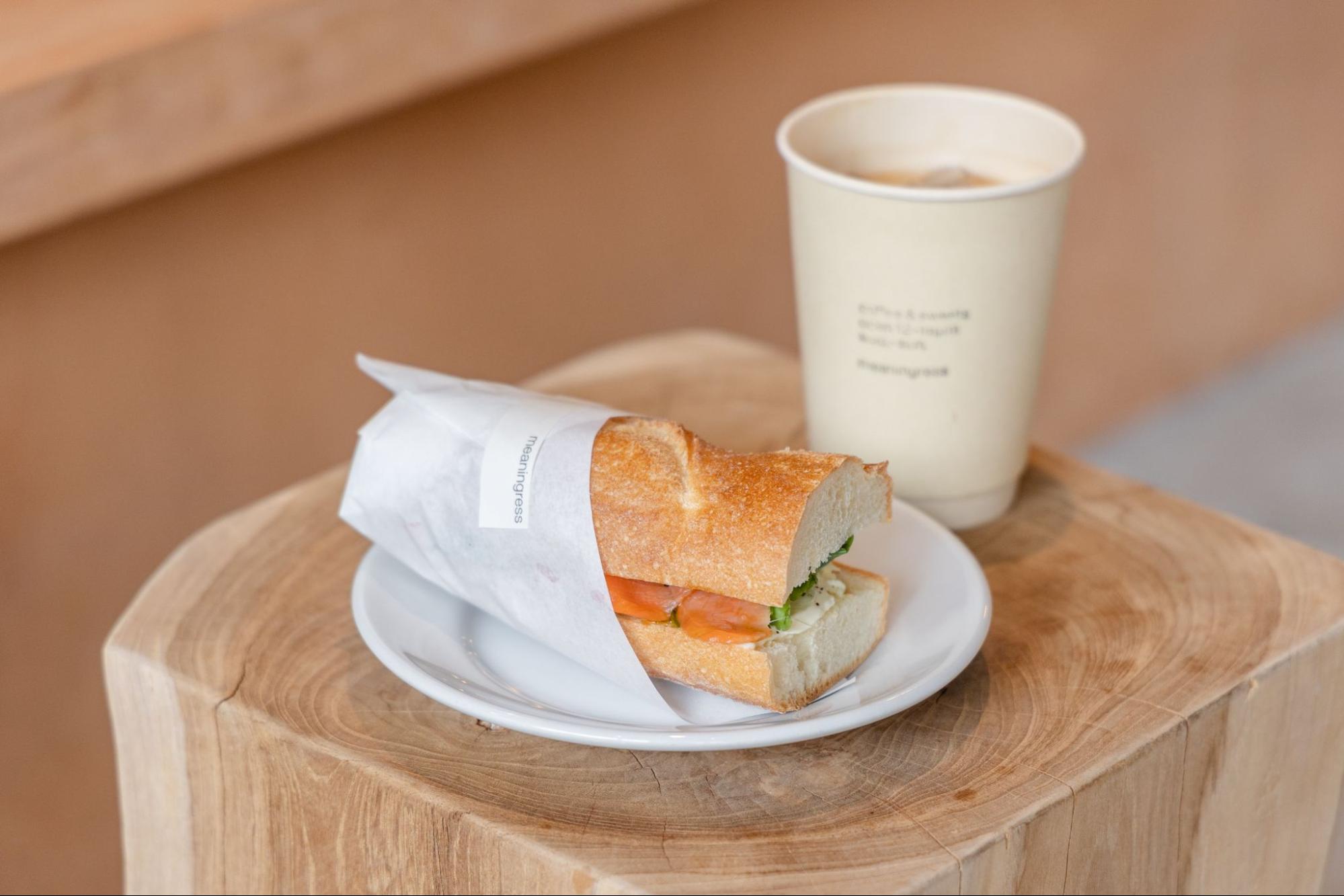スモークサーモンとクリームチーズのバケットサンドは、バケットの香ばしさに、サーモンの塩気とクリームチーズのまろやかさがよく合い、食べ応えも抜群。