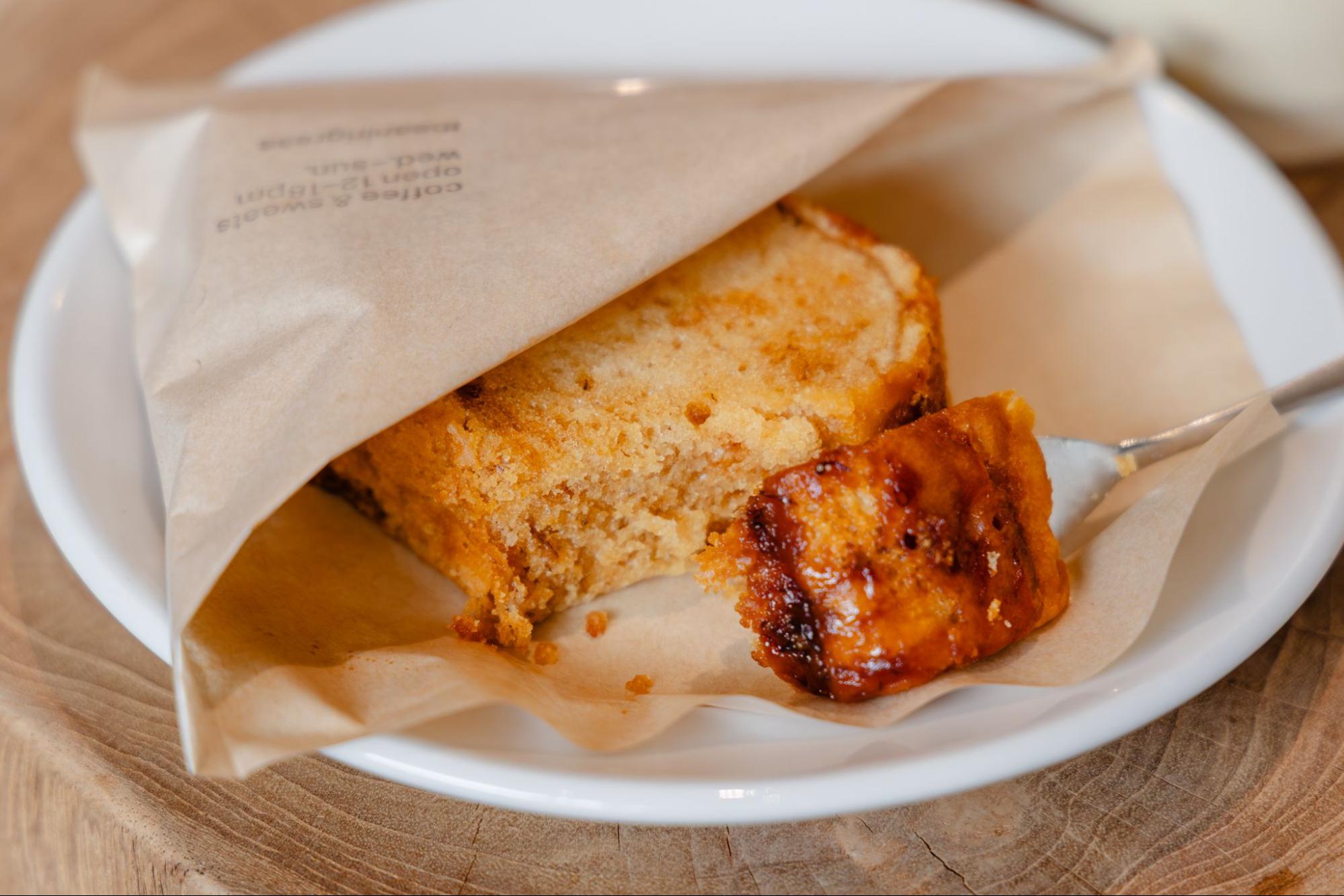 キャラメルバナナの米粉パウンドケーキは、温めると表面はふんわりと軽く、フォークを入れると米粉ならではのもちっとした弾力が感じられます。