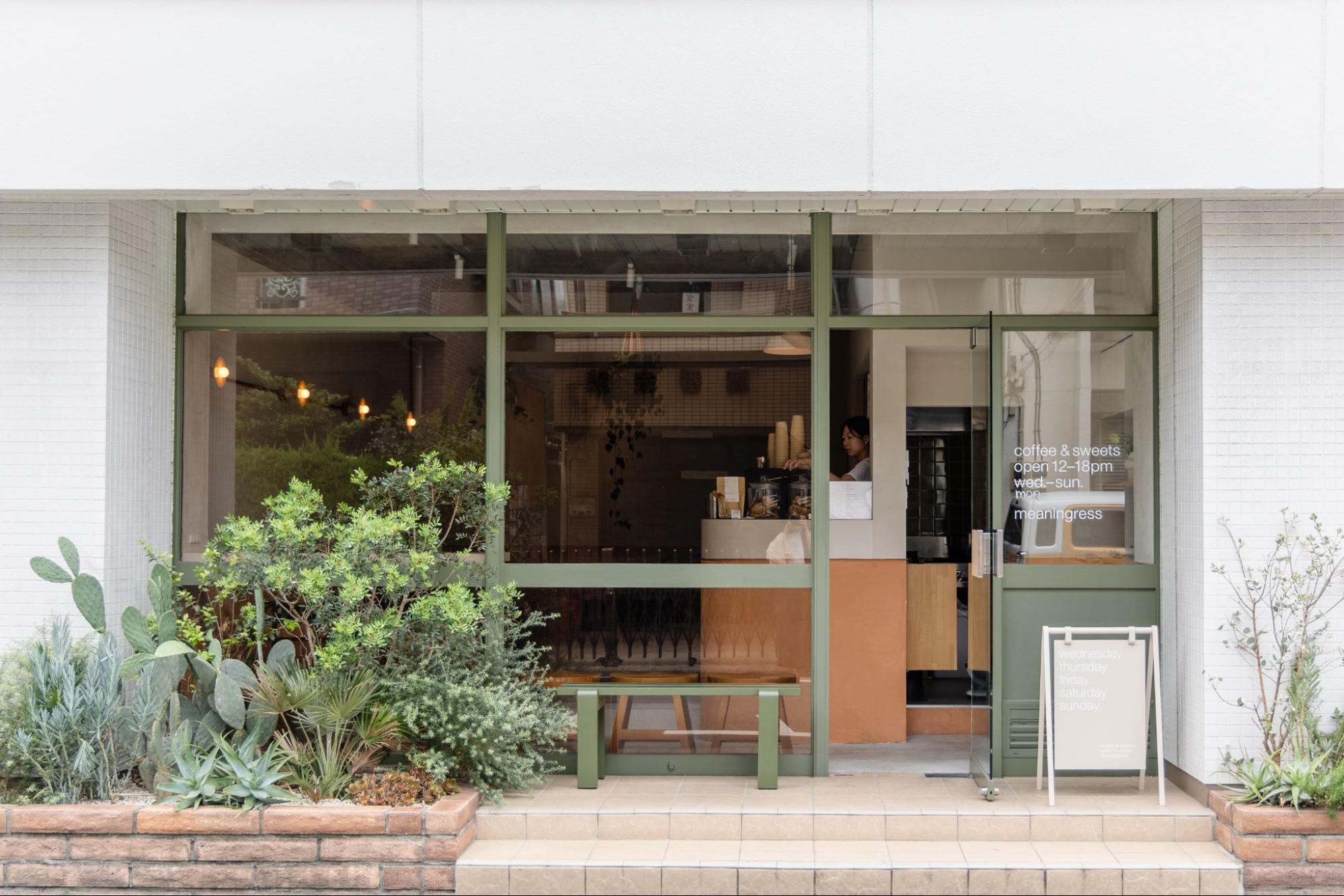 東急線・学芸大学駅から徒歩5分、住宅街の一角にあるmeaningress(ミーニングレス)は、植物とグリーンの扉が印象的な外観のカフェです。