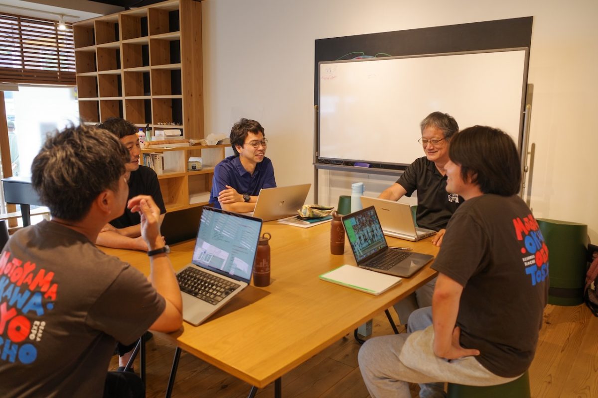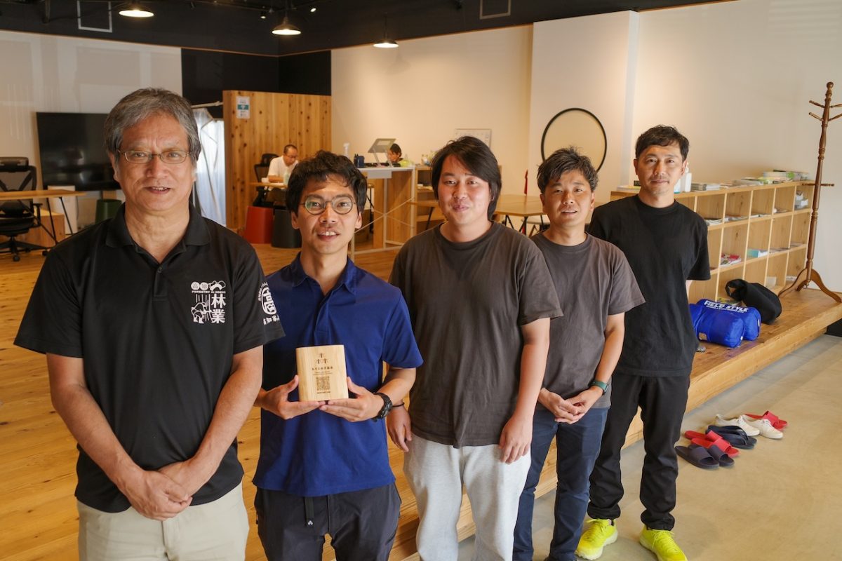 写真左から、代表理事の三好一樹さん、職員の⽴川真悟さん、インターンの佐野翔梧さん、事務局長の尾﨑康隆さん(土佐町役場から出向中)、土佐町地域活性化コーディネーターの松野伸介さん。