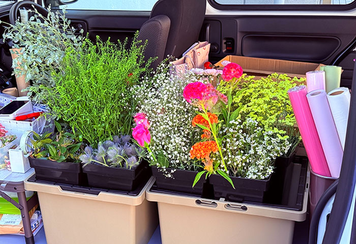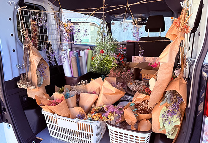 車のドアが開くと、生花やグリーン、トランクにはドライフラワーなど色とりどりの花が並び、希望金額に合わせてその場で花束をアレンジしてもらえます。