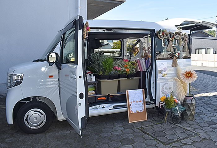 花と風は、車で移動しながら生花やドライフラワーを販売するお花屋さんです。砂田さんは元保育士で、子育て中の人にもほっとできるお花時間を届けたいと思い、どこにでも出店できる移動花屋を始めたそうです。
