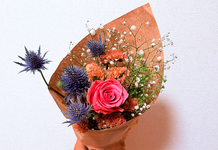 1000円の花束を作っていただきました。取材日はハロウィンが近かったこともあり、紫のエリンジウムが部屋に映えました! 砂田さんから「気に入った色のときに逆さに吊るしてみて! 」とアドバイスいただき、今はドライフラワーの姿を楽しんでいます。
