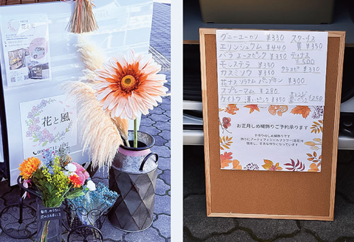 週3~4回、地域センターやスーパーマーケットなどの駐車場、イベント会場で出店しています。スケジュールは花と風のホームページや公式ライン、インスタグラムでチェックを。自宅前へ届ける「軒先花屋サービス」(生花代、出張料込み4400円)もしています。仏花や季節の花などの定期便もできるので相談してみてください。