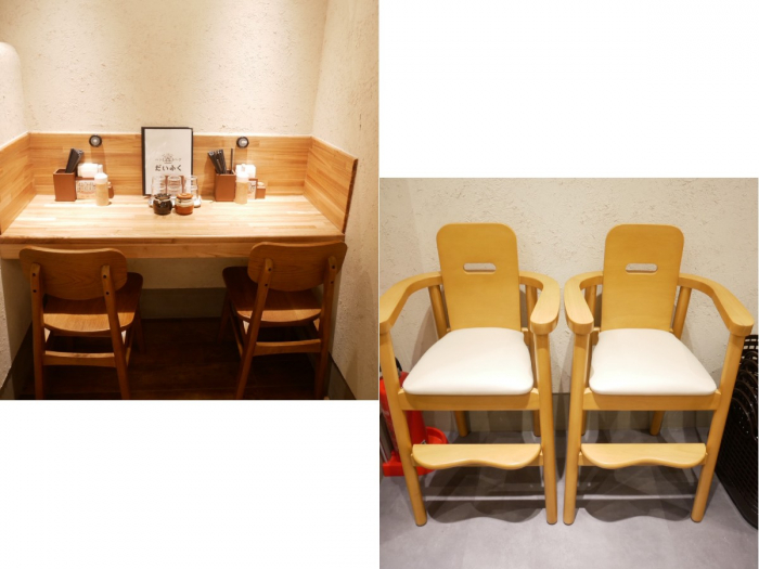 テーブル席とカウンター席の両方が用意されているので、おひとり様でも気兼ねなく利用できます。キッズチェアも完備されているので子連れの方も安心。