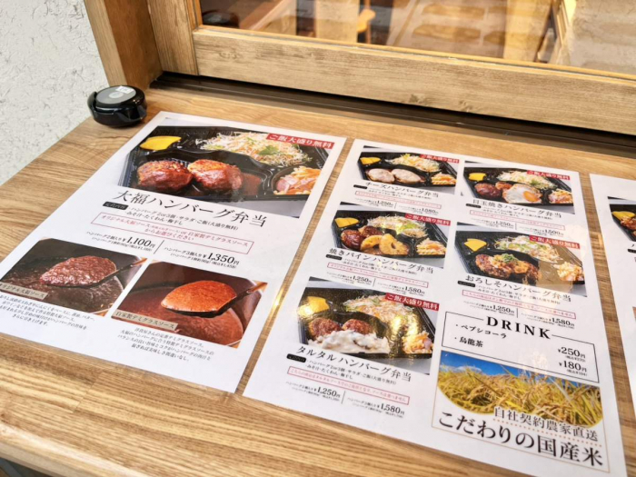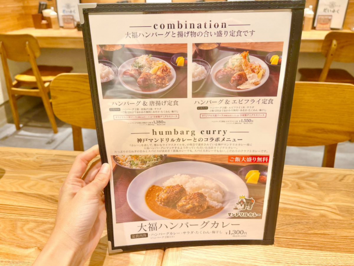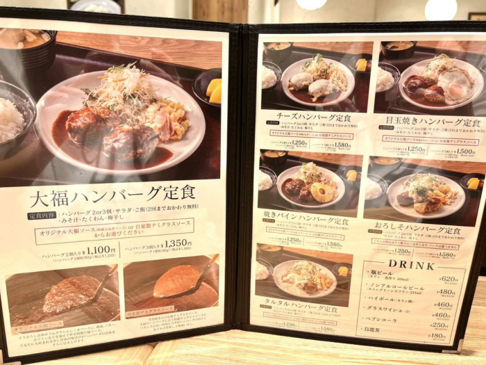 同店のメニューは、シンプルに肉の旨みを味わえる定番「大福ハンバーグ定食」をはじめ、目玉焼き・焼きパイン・おろしそなどのトッピング系、さらにチーズたっぷりの人気メニューまでバリエーション豊富!