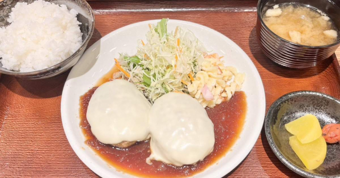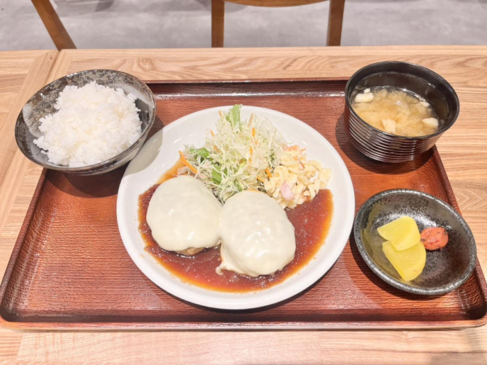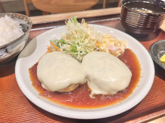 今回注文したのは人気メニューのひとつ「チーズハンバーグ定食」。サラダ・味噌汁・ご飯・たくわん・梅干しが付いており、“定食”としてしっかり満足感が得られる構成が魅力です。