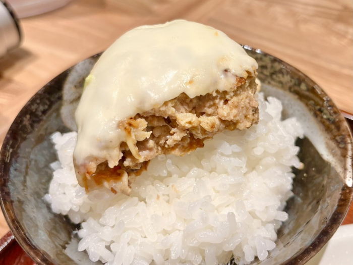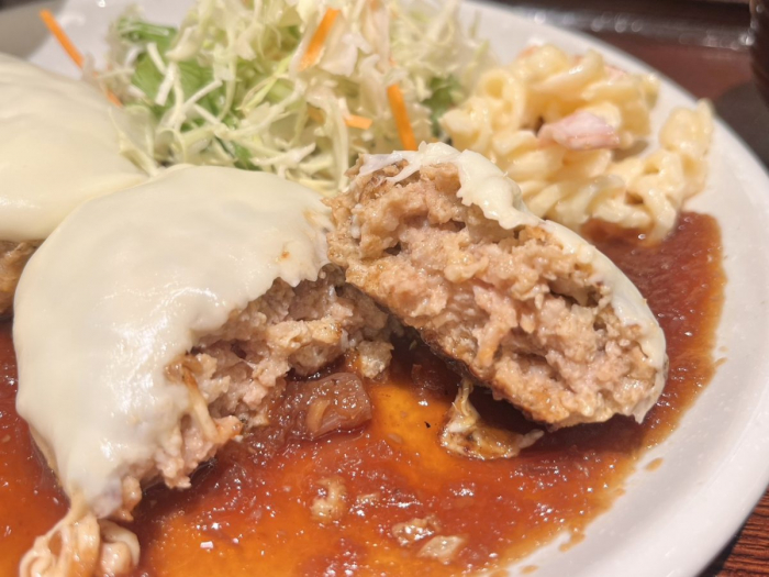 ハンバーグの上にはモッツァレラチーズがたっぷり♪白くとろけたチーズがハンバーグを覆い尽くし、チーズ好きにはたまらないビジュアルです。