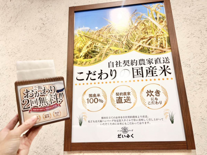 使用しているのは、自社契約農家から直送される国産米。精米仕立てのお米を届けてもらっているため、炊き上がりはふっくら艶やか。ハンバーグの旨みをぐっと引き立てる、主役級の存在感があります。