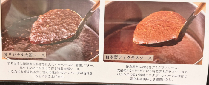 ハンバーグの種類を決めたら最後にソースを選んで注文完了。ソースは2種類あり、ひとつは淡路産玉ねぎのすりおろしとニンニクをベースにした「オリジナル大福ソース」。もうひとつは洋食好きにはたまらない「自家製デミグラスソース」です。
