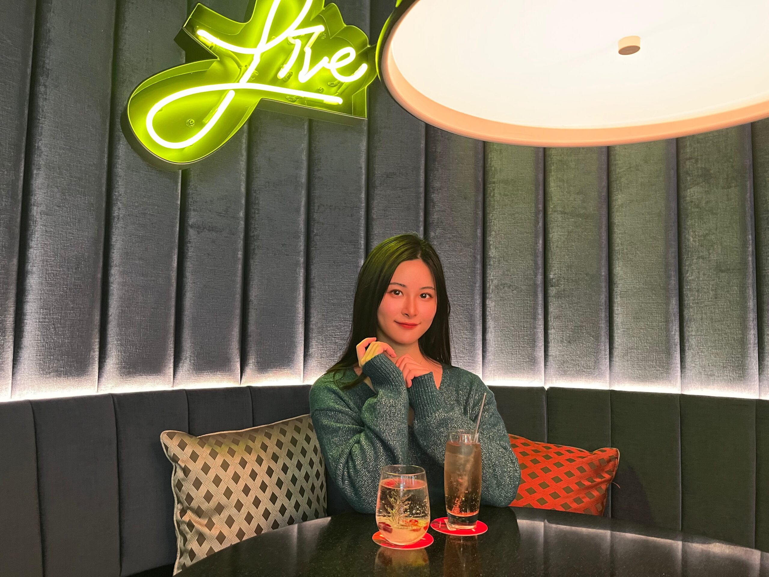 ネオンが輝くおしゃれなカフェ&バーで、ウェルカムドリンクをいただきます。