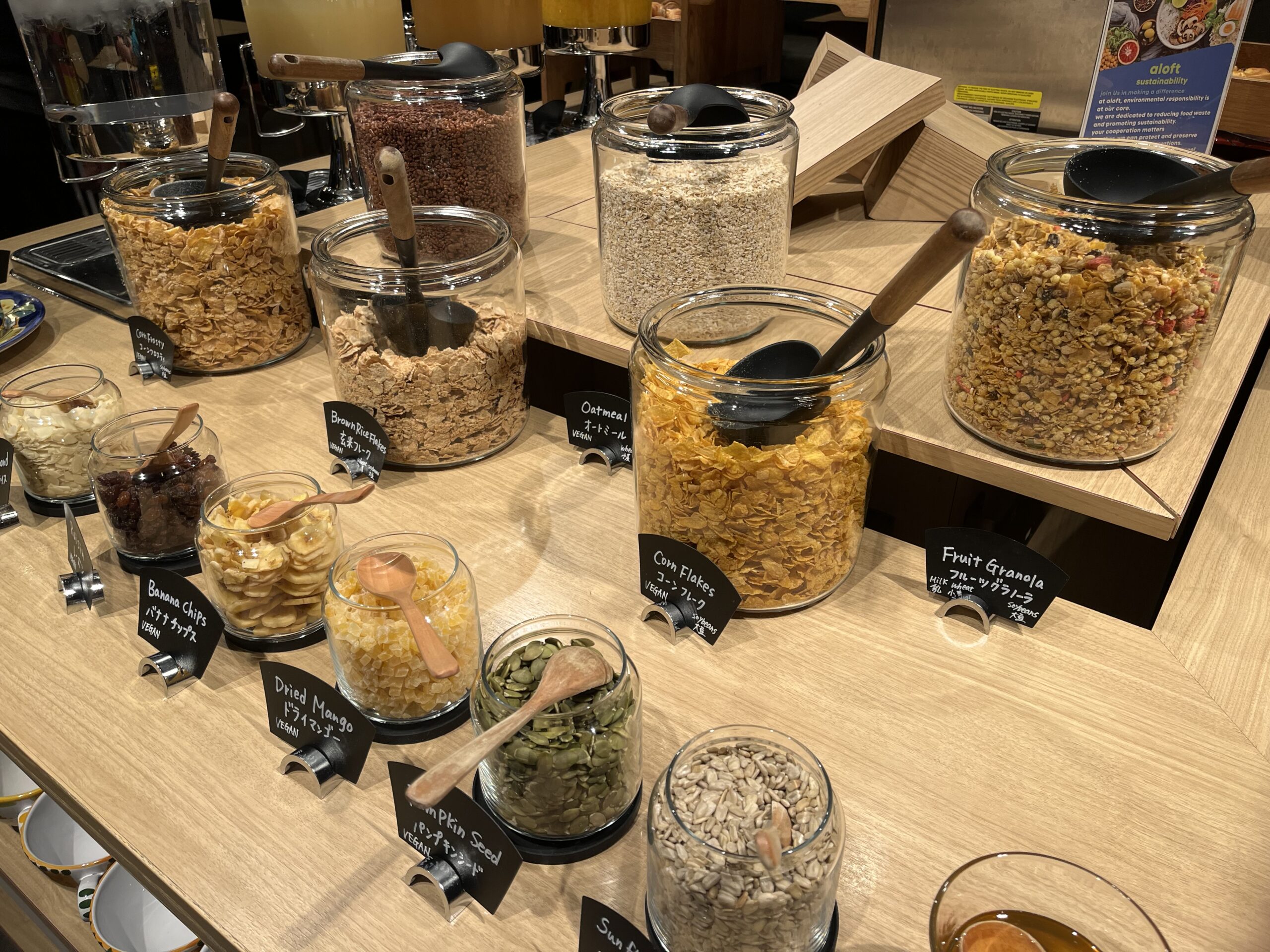 新鮮で彩り豊かな季節のフルーツや数種類のシリアルが並ぶ「シグネチャー・シリアル・バー」は大人気。