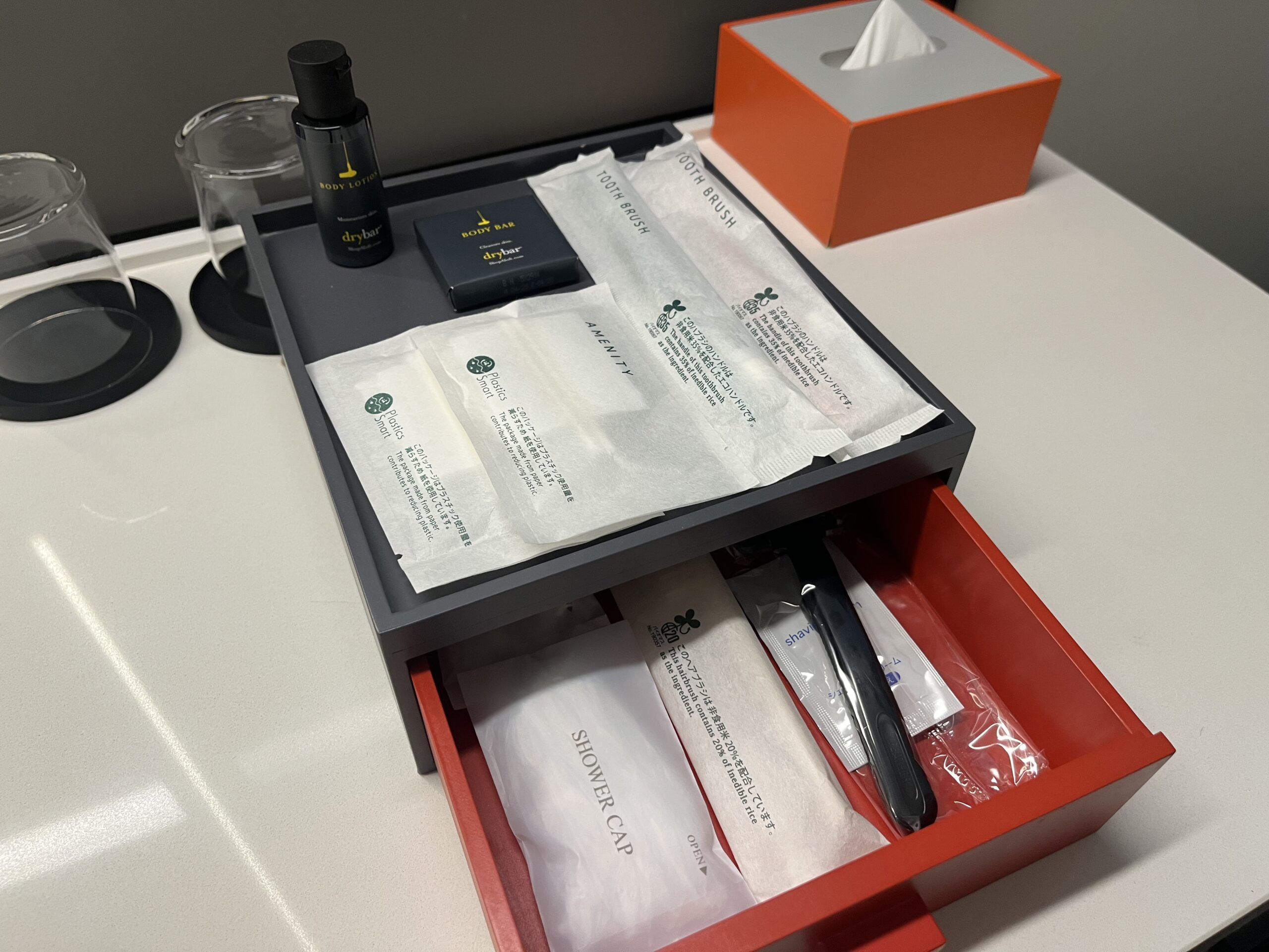 アメニティも充実していて、くし、カミソリ、歯ブラシ、ボディクリームなどが揃っているのが嬉しいポイント。