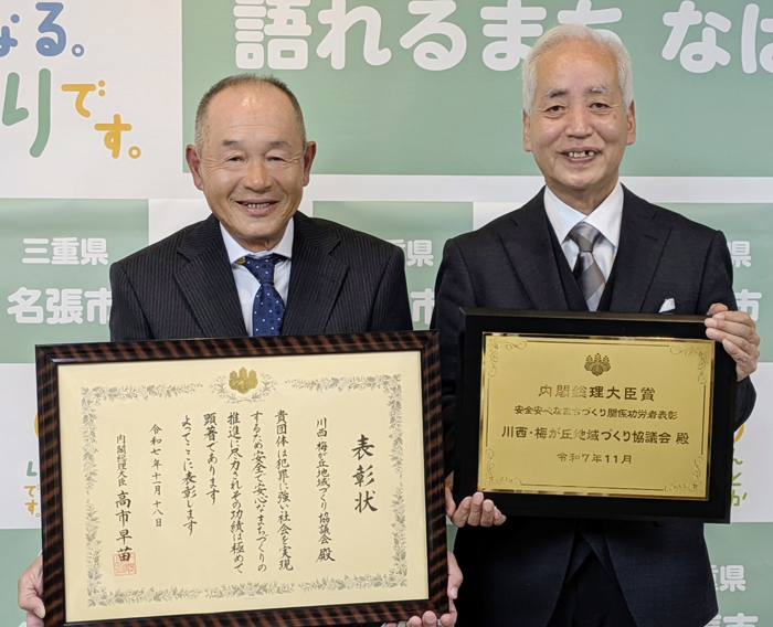 三重県名張市の川西・梅が丘地域づくり協議会が防犯活動を評価され、「安全安心なまちづくり関係功労者表彰 内閣総理大臣賞」を受けた。同協議会の福井重次会長(72)と専従職員の中村勝美さん(69)が11月21日、北川裕之市長を表敬訪問し、受賞を報告した。