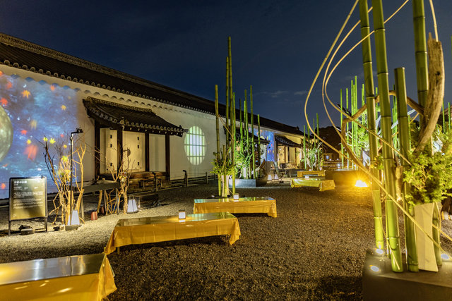 台所前庭では、華道家元池坊とのコラボレーション、伝統と革新が息づく池坊のいけばなが、展示されています。いけばなに癒されながら、夜空の月と、プロジェクションマッピングでも,、優美な観月を楽しめます。