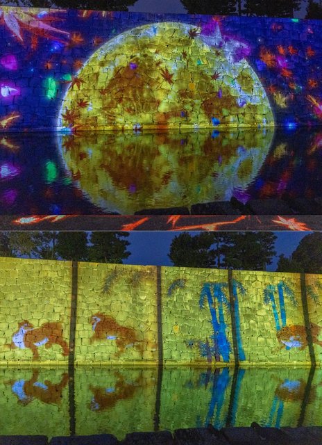 20,000㎡の広さを誇り、本丸を取り囲む内堀。壮大な内堀の壁を使用したプロジェクションマッピングは、毎回見どころの一つです。今回のテーマは、狩野派ゆかりの障壁画と、十三夜の月。水面への映り込みも美しく、障子が開いたり、時折大胆な動きがあるのも魅力の一つです。