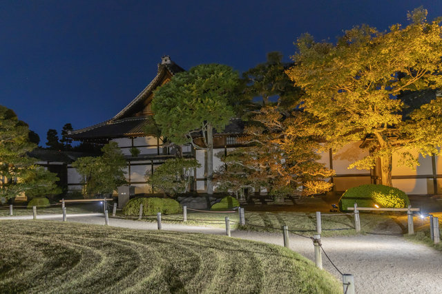 浮かび上がるような幻想的な御殿と、波を模したような白砂。歴史と京都らしい風情を感じる風景に、魅了されます。