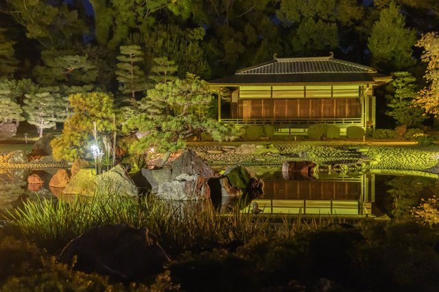 「香雲亭」は通常非公開で、京都の豪商・角倉(すみのくら)家の屋敷跡から移築されたものです。秋を思わせる,、橙や黄金の光で彩られた香雲亭。水面に映り込む風景も幻想的です。