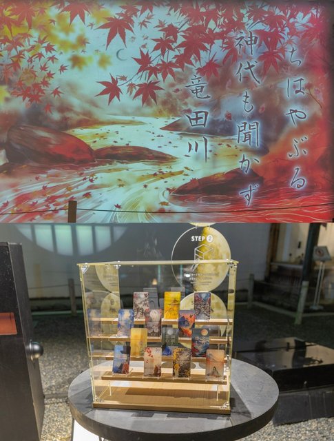 ケースに入ったカードを選び、ボックスでスキャンすると、和歌が映し出される、インタラクティブな体験です。こちらの和歌は、京都府立嵯峨野高等学校 京・平安文化論ラボの生徒さんたちが、「月」や「秋」をテーマにした和歌26首を選定。平安文学研究者・京都先端科学大学 山本淳子教授が監修の元、後水尾天皇ゆかりの歌などを中心に、選定されています。