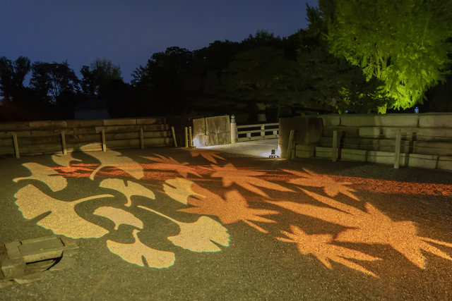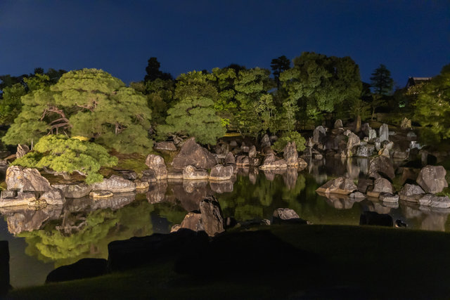 国の特別名勝、二の丸庭園。水の音を感じながら、見事な石組みと常緑樹、池に映り込む風景を鑑賞できるライトアップです。