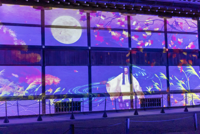 二条城で生活していた人々が、観月会の支度をしている様子と、龍が登場する、華やかなプロジェクションマッピングです。