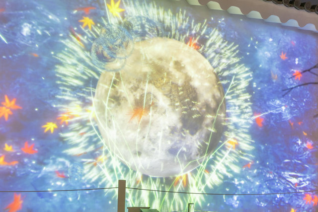 唐門に描かれた彫刻や、月・紅葉も登場する華やかなプロジェクションマッピング。観月会を準備する人たちの影もユニークでした。