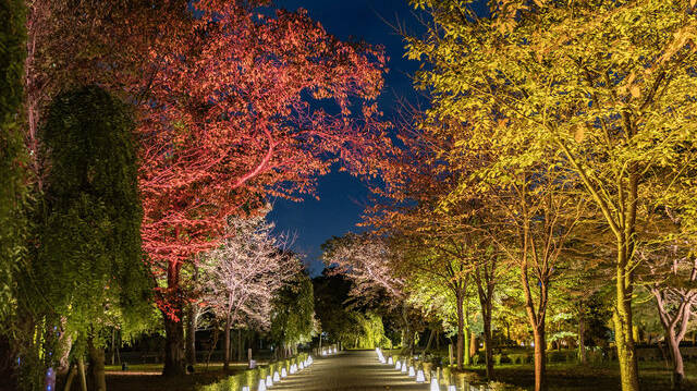 期間中はステージイベントやグルメイベントなどが用意され、紅葉とともに賑やかなイベントが楽しめるほか、17:00~21:00の間は紅葉ライトアップ(イルミネーション「津山城ナリエ」)も行われます。
