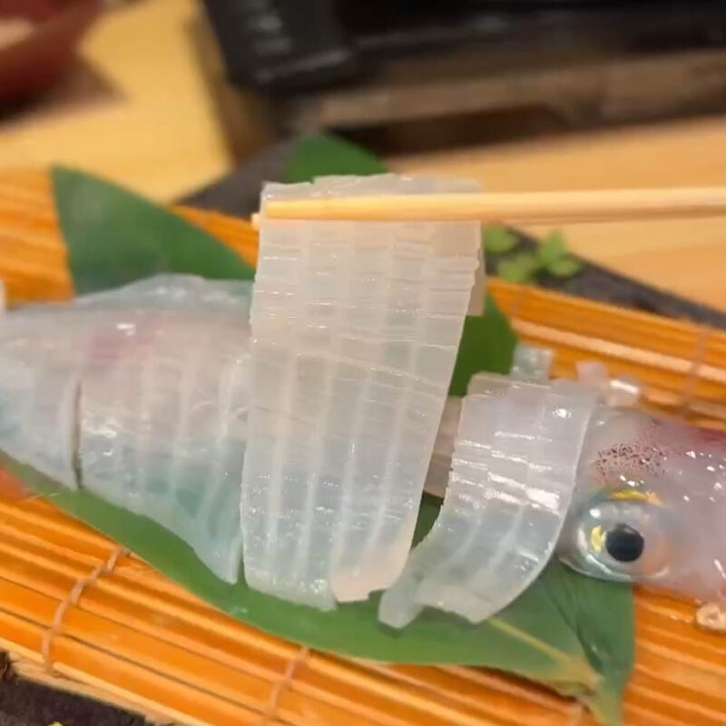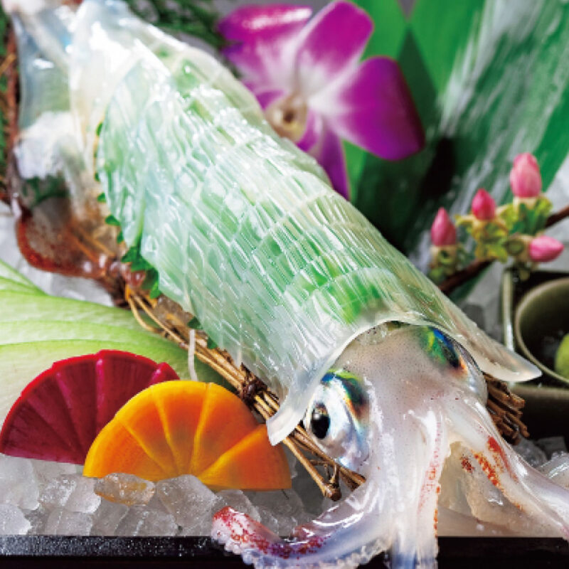 生簀からすくい上げたばかりのイカは、コリコリとした歯ごたえと甘みが格別です。