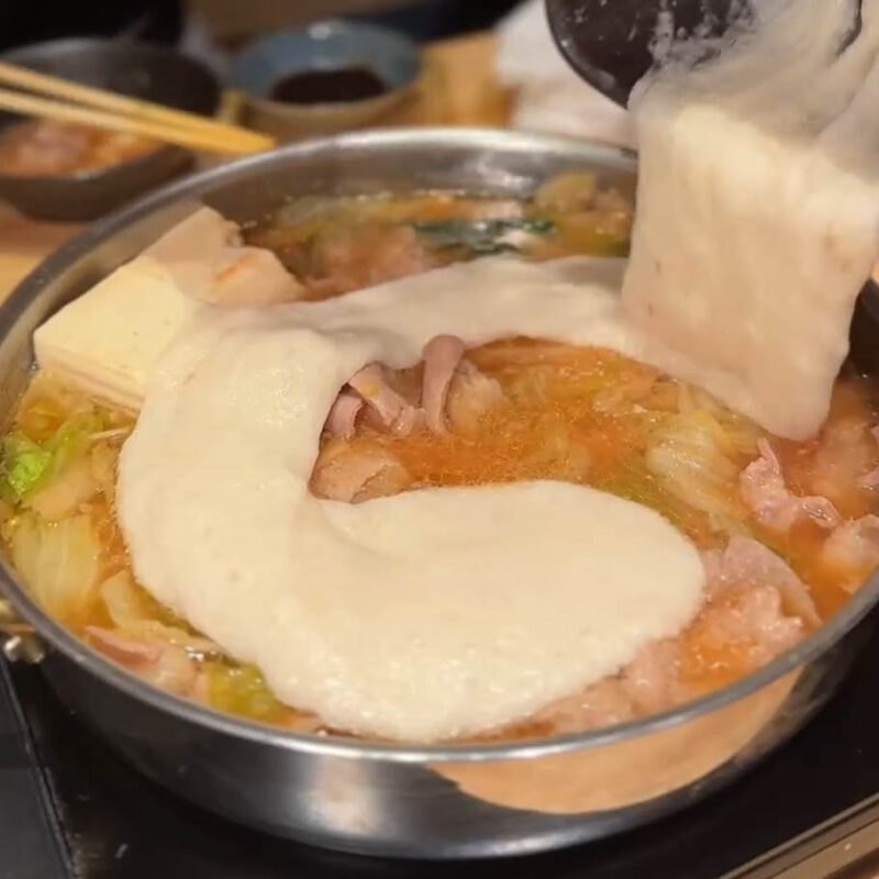 名物のもつ鍋は、明太子ととろろを合わせた少し珍しいスタイル。