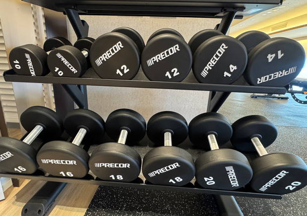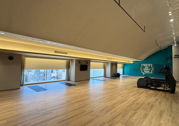 窓から光が差し込む明るい空間で、気持ちよく体を動かせます。タオルやお水も用意されているので手ぶらで利用OK。
