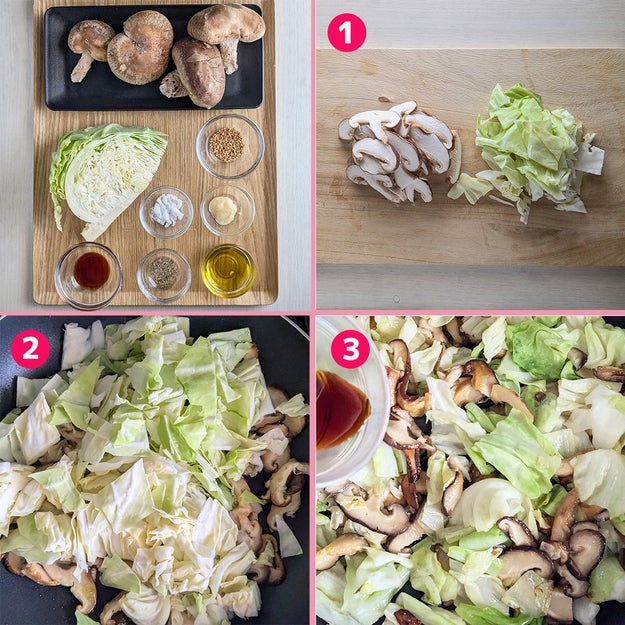 ① しいたけは石づきを切り落とし薄切りにする。キャベツはざく切りにする。