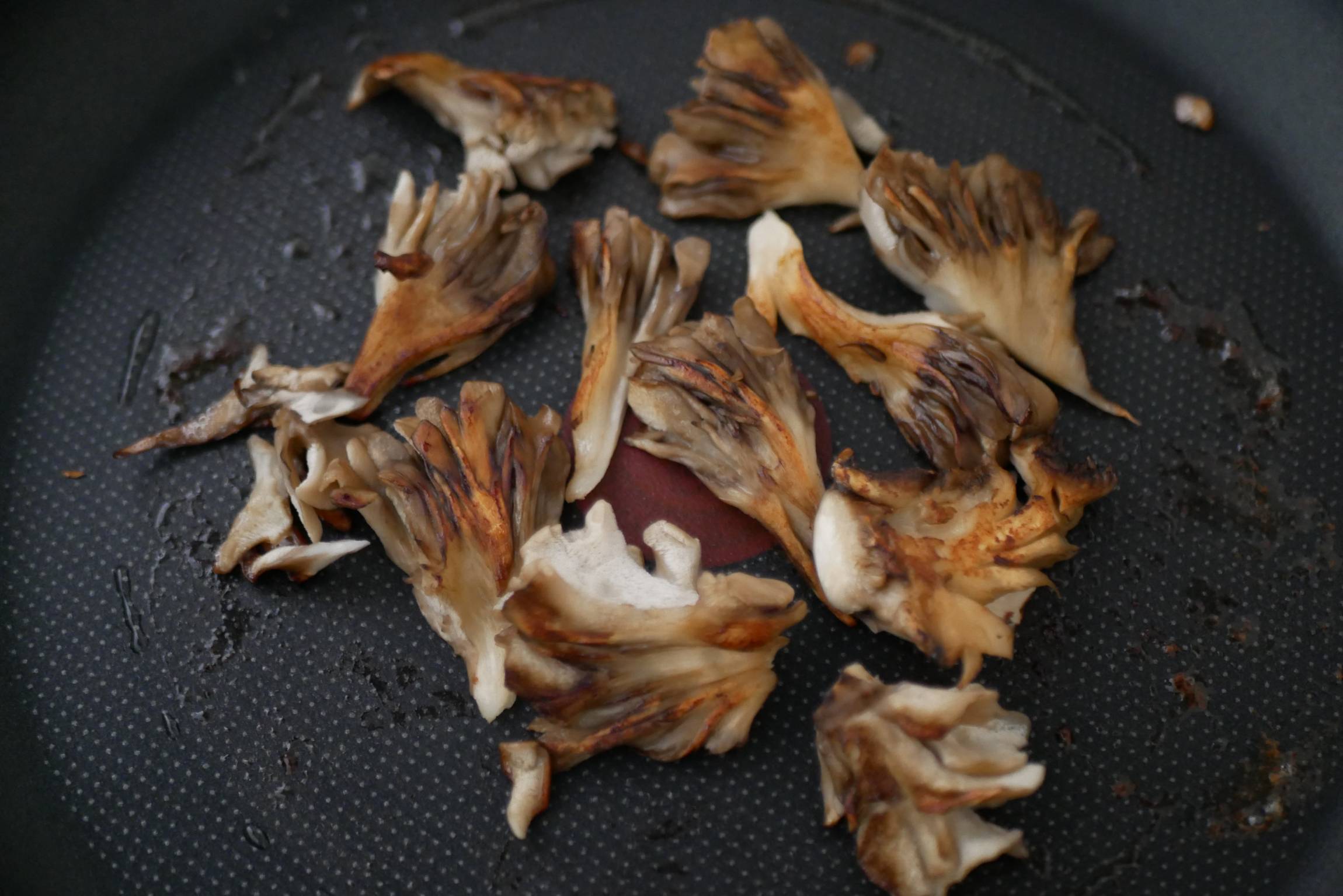 フライパンにバターを入れて中火で熱し、まいたけを入れ軽く炒めたら、蓋をして3分蒸し焼きにします。火加減は中火のままです。