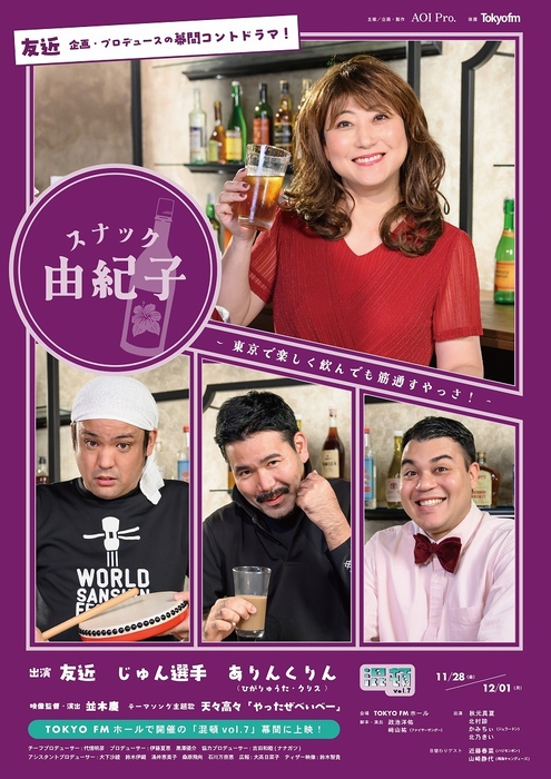 今回のコントドラマは、お笑い芸人として独自の地位を確立し、女優やプロデューサーとしてもマルチに活躍する友近が、主演を務めるだけでなく、企画・プロデュースも担当している。共演には、沖縄を拠点に活動する実力派芸人じゅん選手とありんくりん(ひがりゅうた・クリス)の2組の芸人が引き続き出演する。これまで、ありんくりん公式YouTube「ありんくりんチャンネル」にて、約33万回再生(2025年7月時点)されている「ママと常連のスナックコント」では4人のリアルな掛け合いが人気を博し、この度のコントドラマ『スナック由紀子』でも同一のキャラクターを演じている。