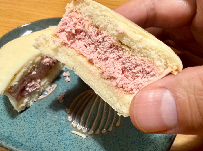いざひと口食べてみると……はいありがとうございます。スポンジがほろっと崩れ、苺ホイップの甘酸っぱさがふわっと広がり、その後にホワイトチョコのミルキーなコクが包み込む。
