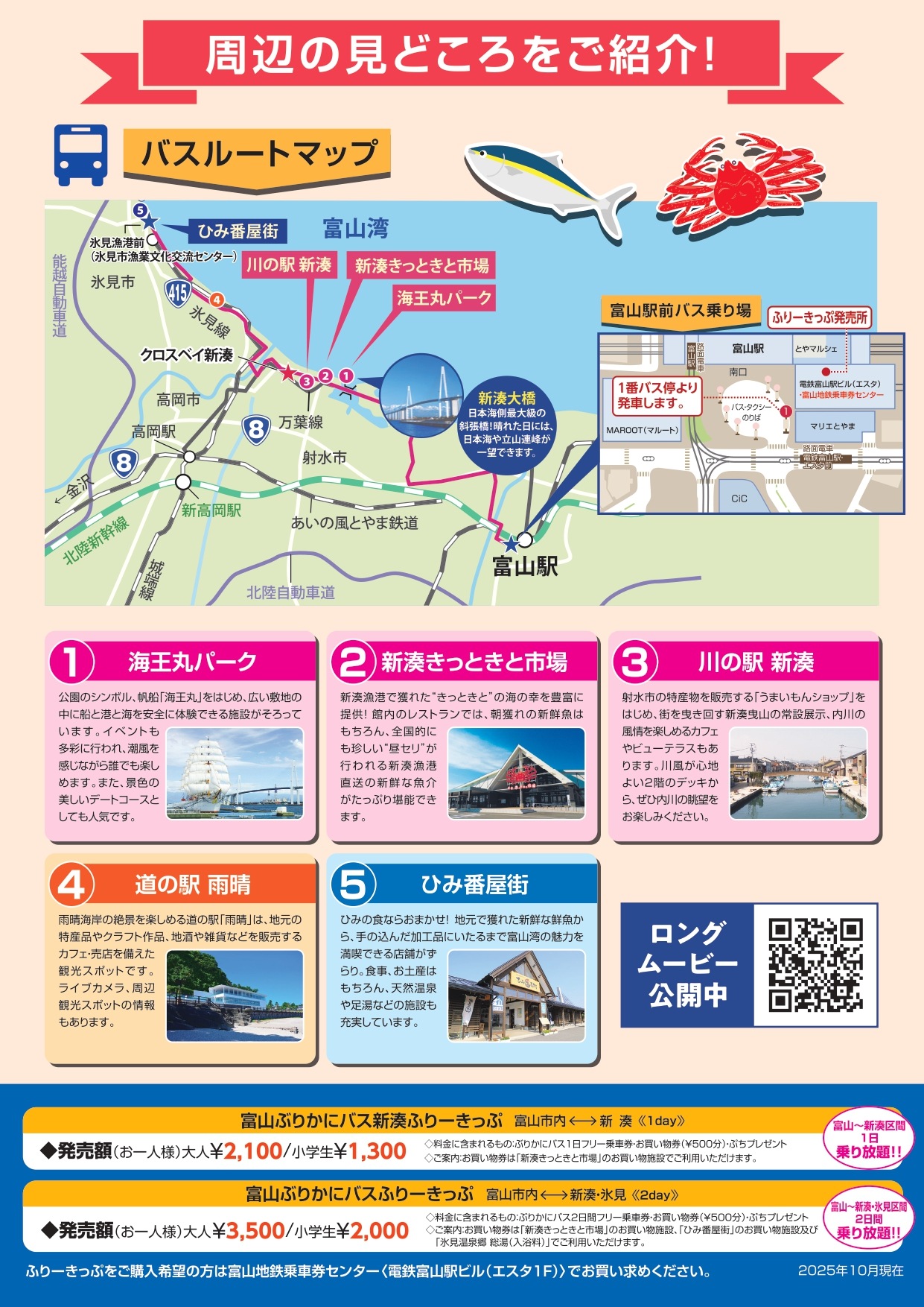 寒ブリで全国的に知られる氷見漁港と昼セリが行われるベニズワイガニ漁がさかんな新湊漁港。富山県内の2大漁港とその周辺を富山駅から乗り換えなしでめぐることができるバスで、水揚げされたばかりの新鮮なブリやカニをベイエリアの観光と一緒に楽しむことができます。