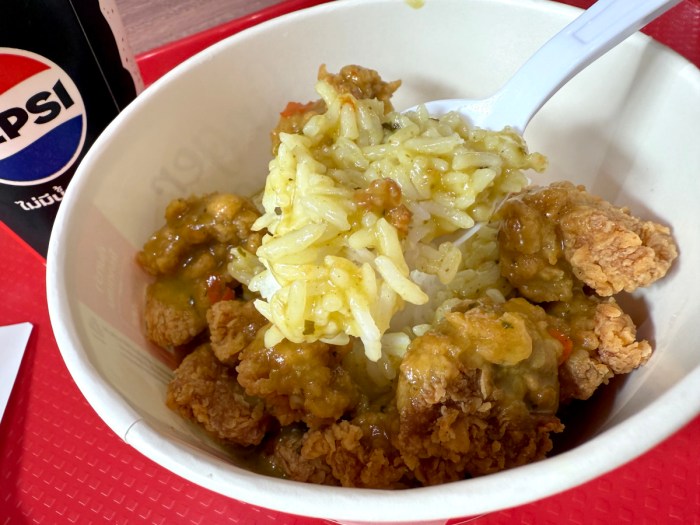 日本でも実際に試してみるかはさておき、軽く小腹を満たせるタイのケンタッキー限定「チキングリーンカレー」は有能なメニューなのではないだろうか? 想像は超えてこないが、約束された味であることは間違いない。