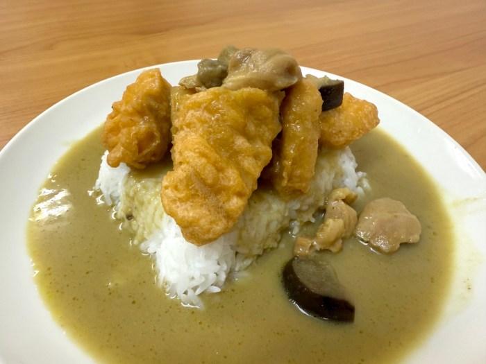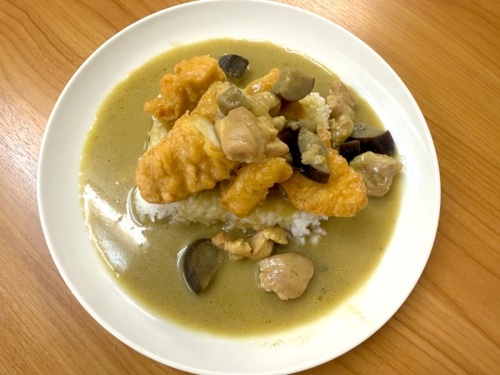 味も「グリーンカレーとチキン」としか言いようがなく、ぶっちゃけ何の化学反応も起きていない。一方で特に足を引っ張っているわけでもなく、純粋に「グリーンカレーにチキンをトッピングした味」と申し上げていいだろう。