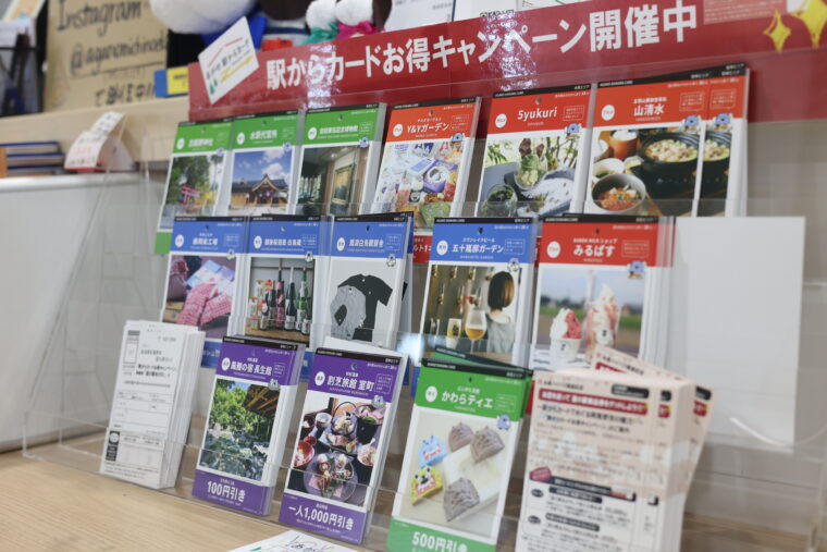道の駅あがので配布中の『駅からカード』は、市内のグルメ、お買い物、観光施設や温泉などをお得に利用できるカードです。