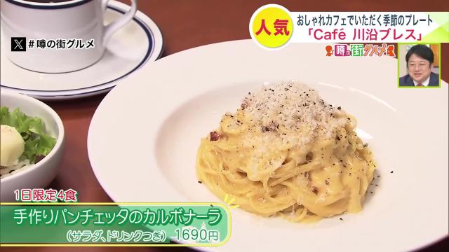 1日限定4食という「手作りパンチェッタのカルボナーラ(サラダ、ドリンク付き)」(1690円)は、「カルボナーラが大好き」という店長が胸を張る自慢のパスタです。