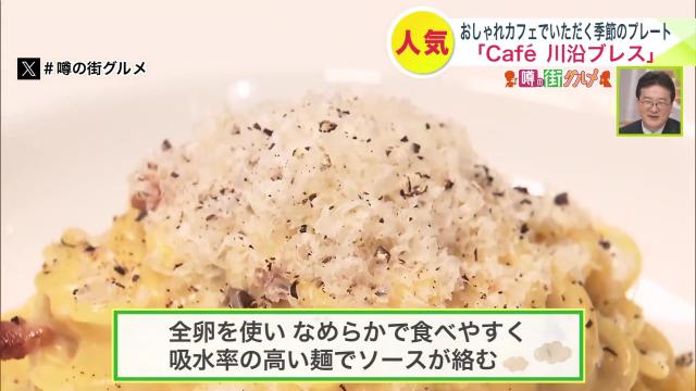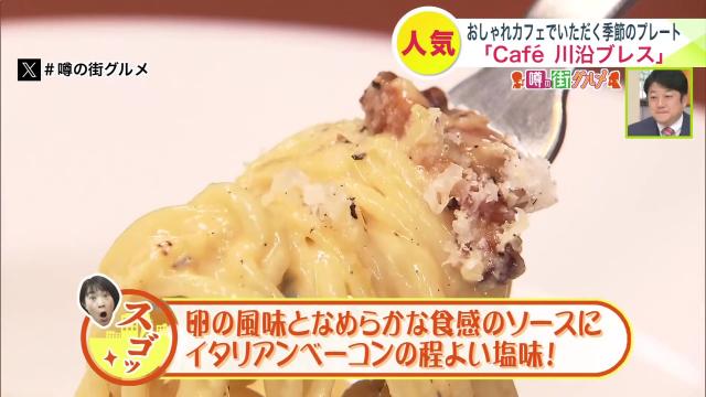 卵の風味と滑らかな食感のソースに、パンチェッタ(イタリアンベーコン)の程良い塩味が効き、石井リポーターも「パンチェッタの塩味が最高にいいですね」と絶賛。