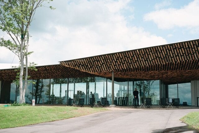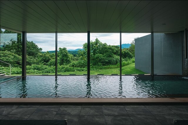 粟ヶ岳を望むロケーションから生まれた野性味のある設計は、世界的な建築家である隈研吾氏によるもの。